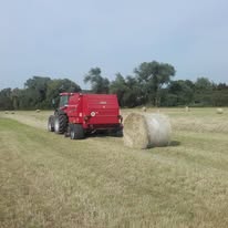Unser Heu ist ideal für die Pferdefütterung. Wir mähen in der Regel nach der Blüte, so dass das Futter einen hohen Rohfaseranteil hat. Wir verwenden keinen Dünger und keine Pestizide. Die Ballen werden trocken in unserer Halle gelagert.